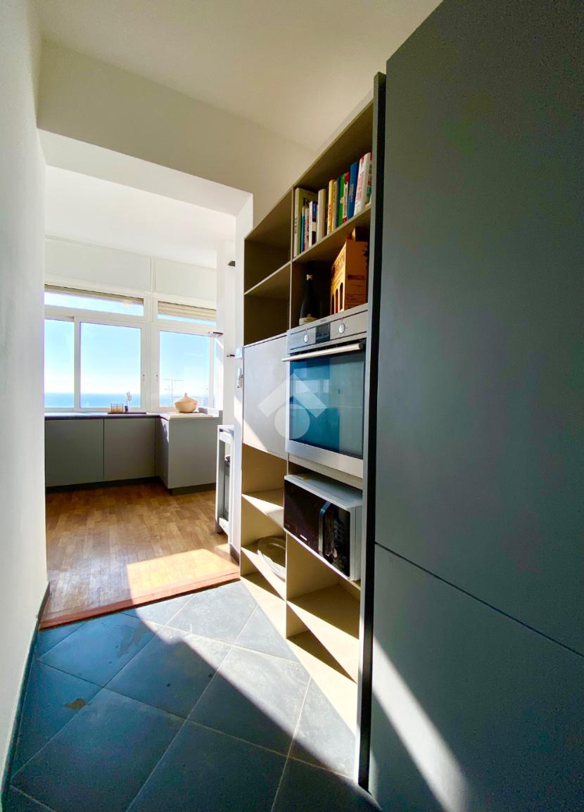 ingresso, splendido openspace cucina/soggiorno con panoramica vetrata vista mare, 3 camere da letto, una cabina armadio, doppi servizi con box doccia e per concludere due ampi terrazzi con vista mare. Termina la proprietà una cantina al primo piano del condominio.