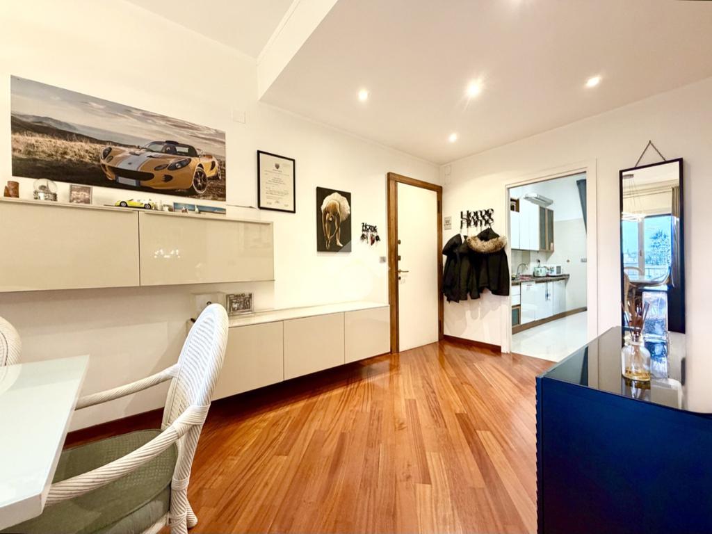 la zona giorno è costituita dall'ingresso aperto sull'ampio soggiorno soleggiato, servito da un balcone esposto ad Est e dalla cucina abitabile altresì servita da un altro balcone esposto ad Ovest. La zona notte invece, separata da quella giorno dal corridoio, è costituita da due camere da letto matrimoniali, servite anch'esse da un balcone, un bagno finestrato con un moderno e comodo box doccia e da una dispensa posizionata in fondo al corridoio. Conclude la proprietà un posto auto privato adiacente al condominio.